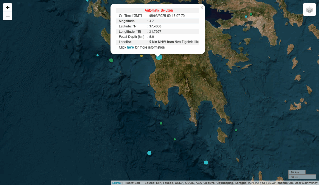Η αυτόματη λύση του του Ευρωμεσογειακού Ινστιτούτου δείχνει μέγεθος 5.0 R και εστιακό βάθος 27 Km