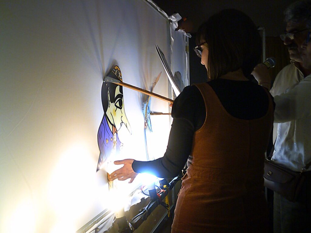 Το απόγευμα του Σαββάτου, πίσω στις εγκαταστάσεις του Κέντρου, υλοποιήθηκε βιωματικό εργαστήριο με τίτλο «Το θέατρο σκιών ως παιδαγωγικό εργαλείο» και συντονιστή τον Στέφανο Παπαγεωργίου, παιδαγωγό και καραγκιοζοπαίχτη. Οι εκπαιδευτικοί, χωρισμένοι σε ομάδες, αξιοποίησαν τις καταγραφές του πρωινού μονοπατιού, δημιούργησαν μικροσενάρια και παρουσίασαν τη δική τους παράσταση με τις φιγούρες του θεάτρου σκιών.