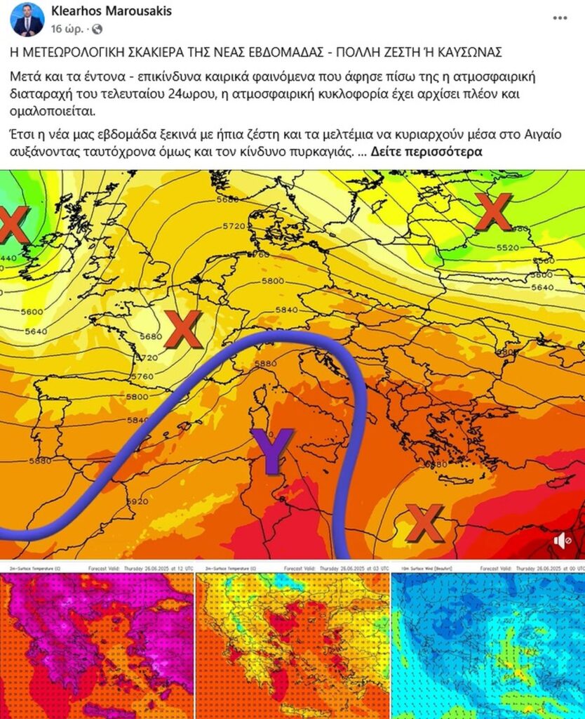Σύμφωνα με την ανάρτηση του μετεωρολόγου Γιώργου Τσατραφύλλια την Πέμπτη και την Παρασκευή η θερμοκρασία θα σκαρφαλώσει στους 41 βαθμούς σε Θεσσαλία, Κιλκίς, Σέρρες και Αιτωλοακαρνανία.