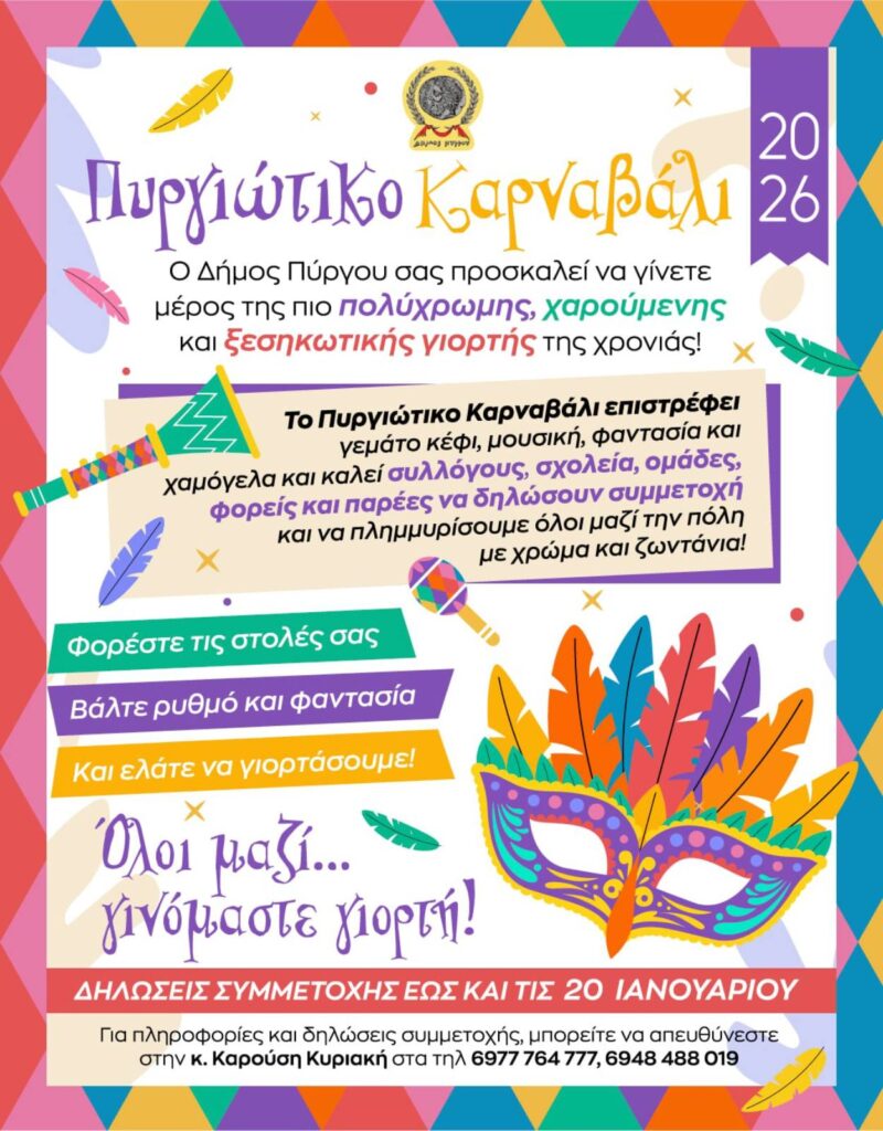 Το Καρναβάλι Πύργου επιστρέφει γεμάτο κέφι, μουσική, φαντασία και χαμόγελα και καλεί συλλόγους, σχολεία, ομάδες, φορείς και παρέες να δηλώσουν συμμετοχή και να πλημμυρίσουμε όλοι μαζί την πόλη με χρώμα και ζωντάνια.