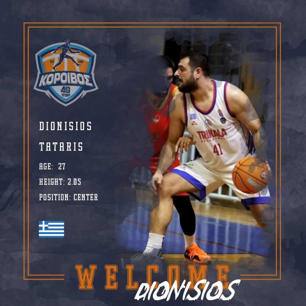 Ο Κόροιβος ανακοίνωσε την μεταγραφή του 27χρονου Πυργιωτη σέντερ, Διονύση Τάταρη, που έχει ήδη αγωνιστεί στα δύο τελευταία παιχνίδια της ομάδας με Δάφνη εκτός και Μεγαρίδα εντός. Ο Τάταρης έχει παίξει άλλες δύο σεζόν στον Κόροιβο, στην Elite League, τις σεζόν 2019-2020 και 2021-2022.