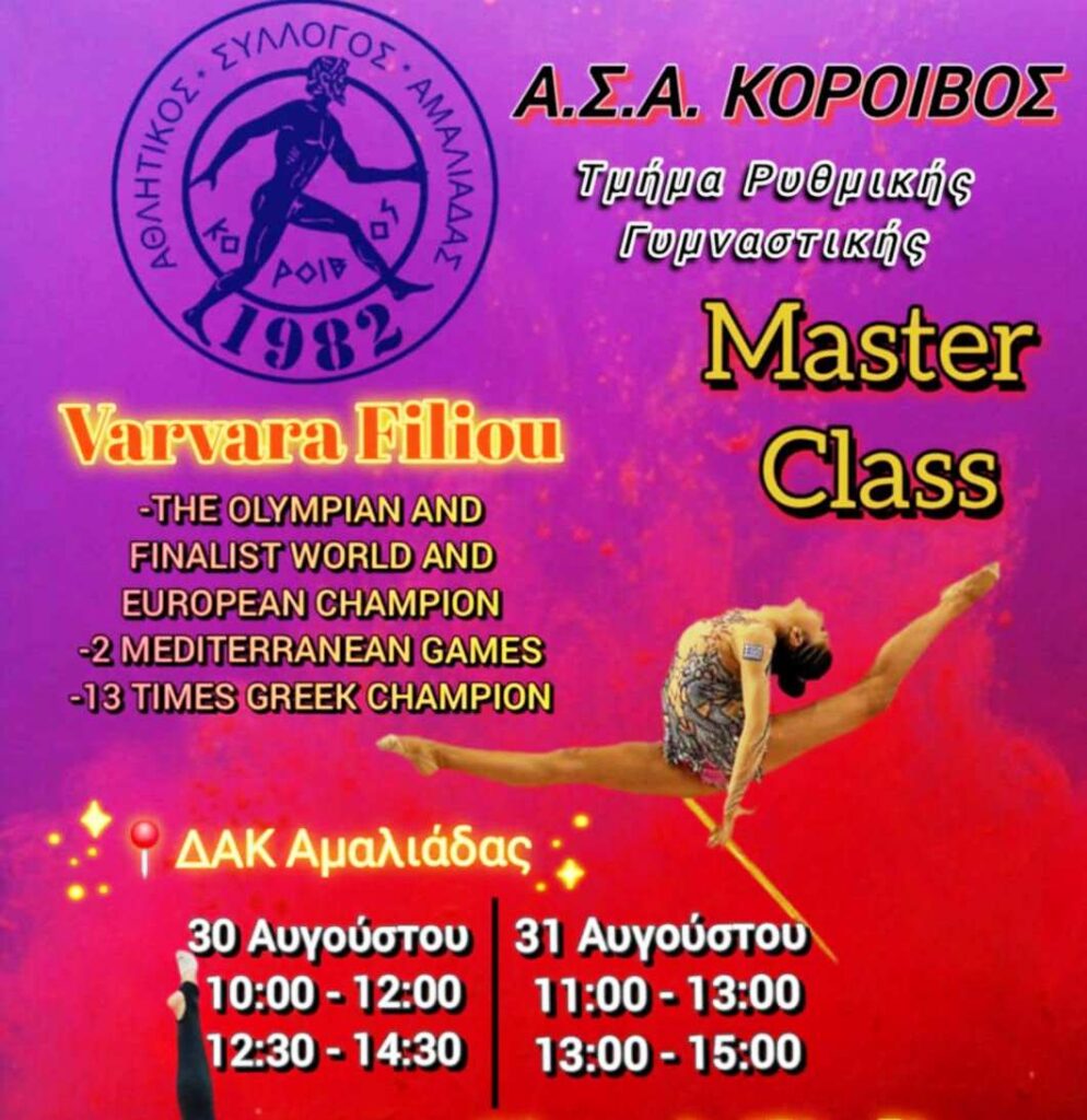 καλεί παιδιά ηλικίας 4 ετών και πάνω, στις 30 Αυγούστου (10:00-12:00 & 12:30-14:30) και 31 Αυγούστου (11:00-13:00 & 13:00-15:00) στο Δ.Α.Κ. Αμαλιάδας, να γνωρίσουν το άθλημα της ρυθμικής γυμναστικής συμμετέχοντας σε προπόνηση υψηλών προδιαγραφών, μέσω ενός master class. Μπορούν να συμμετάσχουν παιδιά από 4 χρόνων και άνω, ανεξάρτητα εάν έχουν ξανακάνει ρυθμική ή όχι.