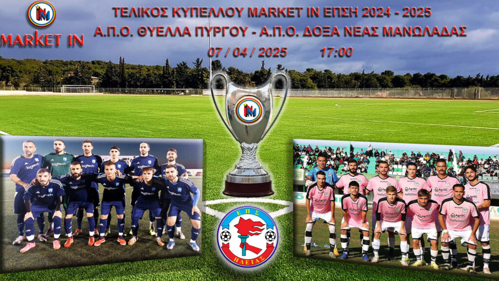 Η Ε.Π.Σ. Ηλείας σε ανακοίνωσή της καλεί τον φίλαθλο κόσμο να τιμήσει με την παρουσία του τον τελικό του Κυπέλλου ΜΑRΚΕΤ ΙΝ, μεταξύ των σωματείων Α.Π.Ο. Θύελλα Πύργου –Α.Π.Ο. Δόξα Νέας Μανωλάδας. Η τιμή του εισιτηρίου είναι 5 ευρώ.