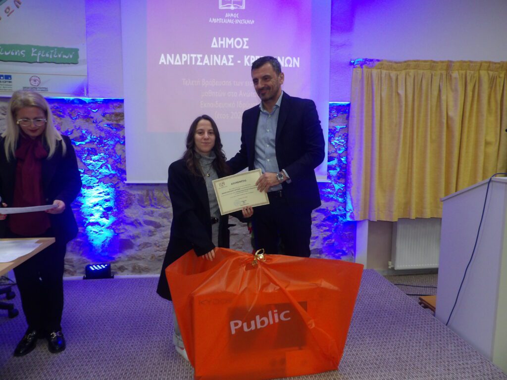 Ακολούθησε η βράβευση των νέων φοιτητών που περιλάμβανε και από μια τηλεόραση, ως συμβολικό δώρο από το Δήμο Ανδρίτσαινας-Κρεστένων για την επιτυχία τους!