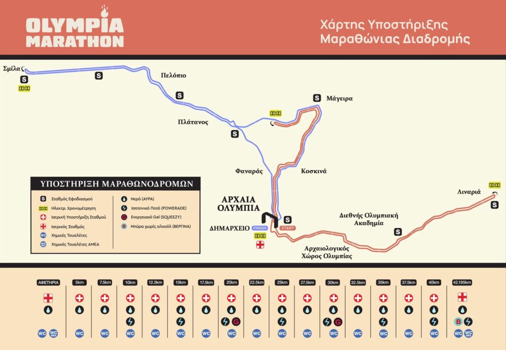 Ο αγώνας των 42,195 χιλιομέτρων ακολουθεί μία μοναδική ιστορική διαδρομή από την πλατεία του Δημαρχείου της Αρχαίας Ολυμπίας, με φόντο γραφικά χωριά και αρχαιολογικούς χώρους, και τερματίζοντας στο Δημαρχείο της πόλης που γέννησε τους Ολυμπιακούς Αγώνες. Παράλληλα θα διεξαχθούν: