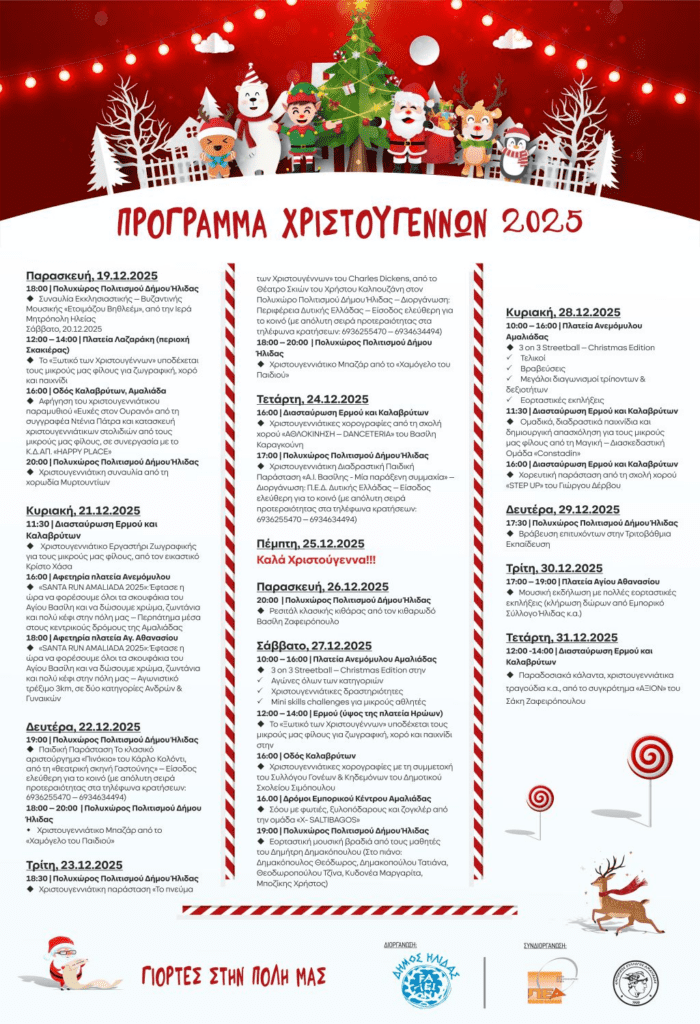 Με ένα πλούσιο και πολυδιάστατο εορταστικό πρόγραμμα, που απευθύνεται σε όλους τους πολίτες και δίνει πρωταγωνιστικό ρόλο στα παιδιά, ο Δήμος Ήλιδας υποδέχεται τα φετινά Χριστούγεννα, δημιουργώντας μια ζεστή γιορτινή ατμόσφαιρα σε ολόκληρη την Αμαλιάδα.