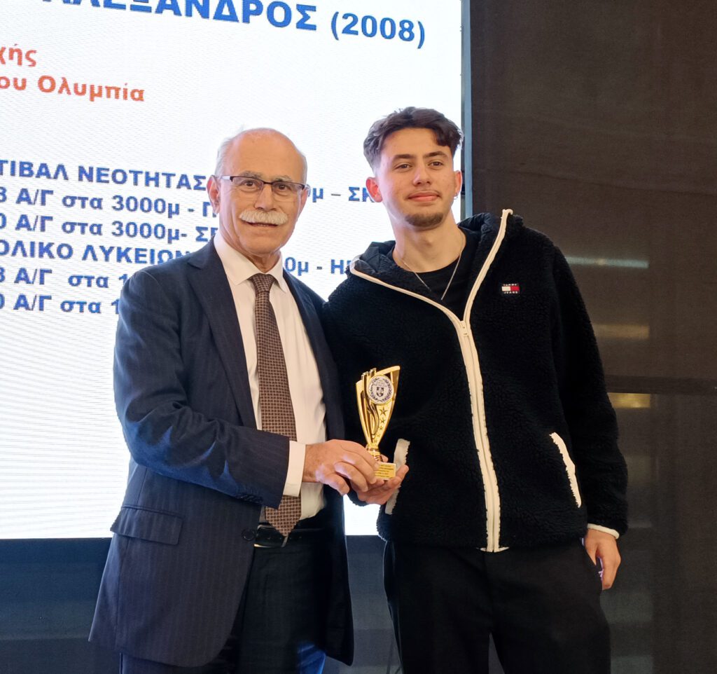 Η βράβευση του Ανδρέα Καλογερόπουλου και του προπονητή και πατέρα του, Άρη, από την Μαρία Σωτηρακοπούλου.