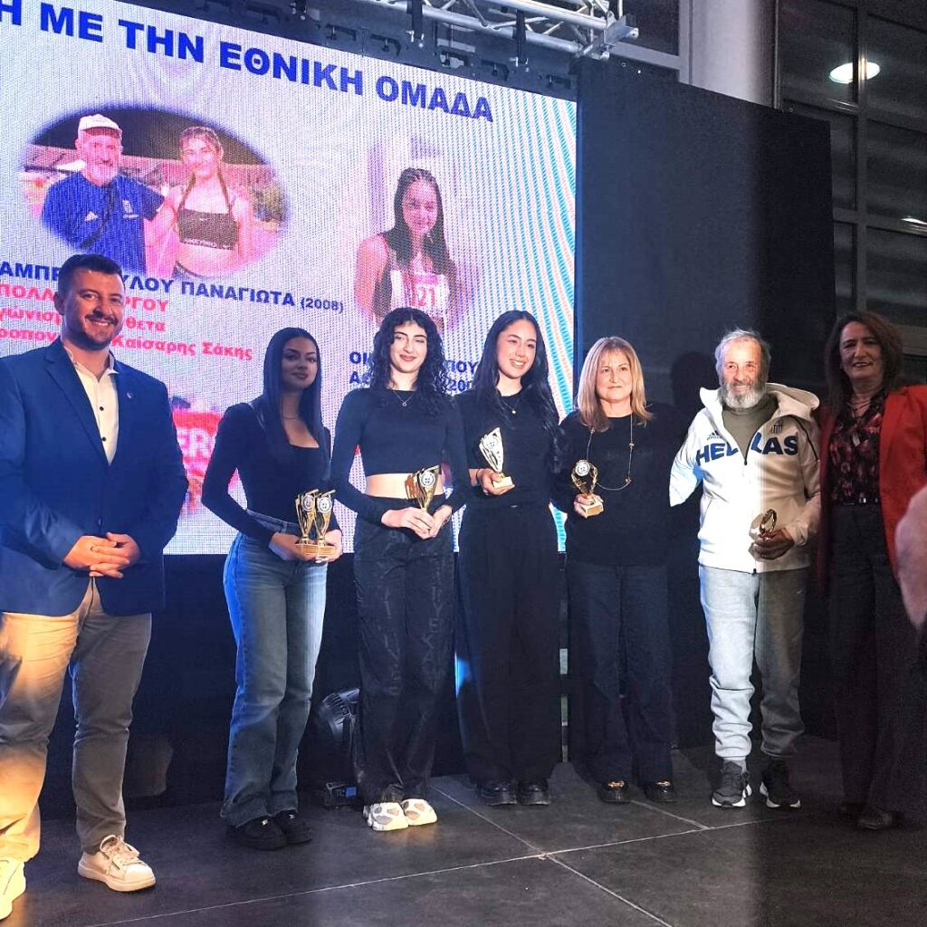 Η βράβευση της Παναγιώτας Λαμπροπούλου και της Νικολίας Μυλωνά με τους προπονητές τους Σάκη Καίσαρη και Χαρά Κουτσούνη, αντίστοιχα.