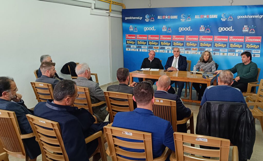 Στιγμιότυπο από την σύσκεψη στο Κλειστό του Πύργου με θέμα την αναβάθμιση των αθλητικών υποδομών στον κλασικό αθλητισμό.