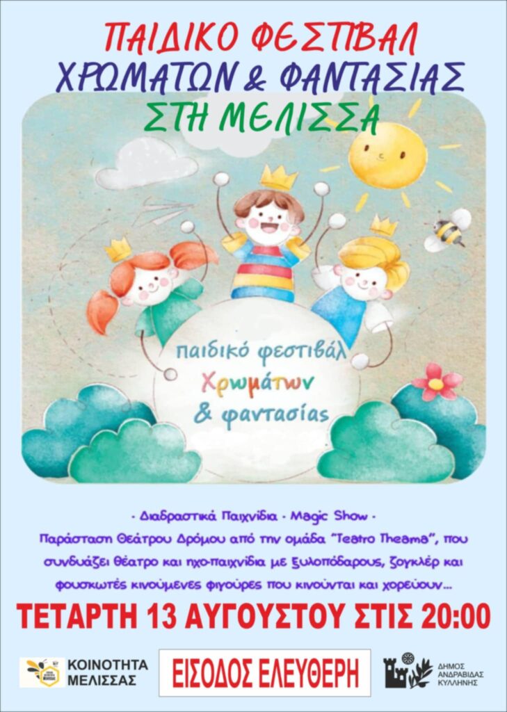 Σας προσκαλούμε στο «Παιδικό Φεστιβάλ Χρωμάτων και Φαντασίας» που θα πραγματοποιηθεί στη Μέλισσα στις 13 Αυγούστου στις 20:00