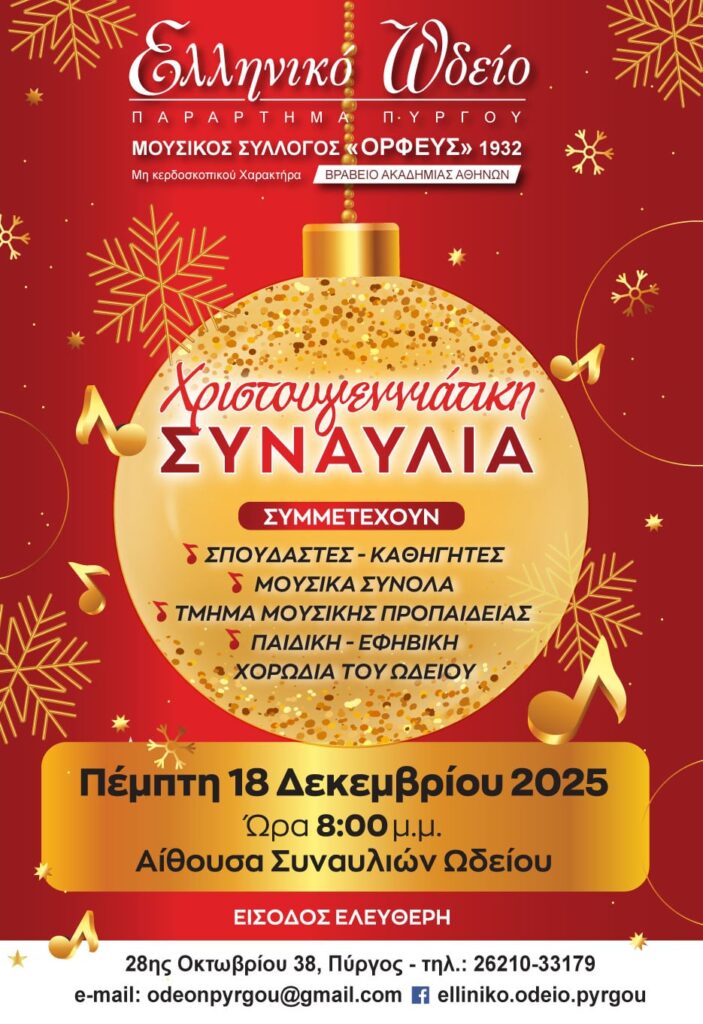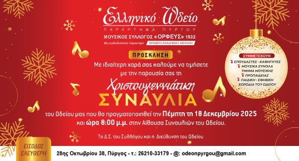 Με πολύ μεράκι και αγάπη από όλους τους συντελεστές προετοιμάζεται η καθιερωμένη Χριστουγεννιάτικη συναυλία του ΜΟΥΣΙΚΟΥ ΣΥΛΛΟΓΟΥ ΟΡΦΕΥΣ/ΕΛΛΗΝΙΚΟΥ ΩΔΕΙΟΥ ΠΥΡΓΟΥ με την οποία θα υποδεχθεί μελωδικά τις άγιες μέρες των Χριστουγέννων και τον ερχομό του 2026.