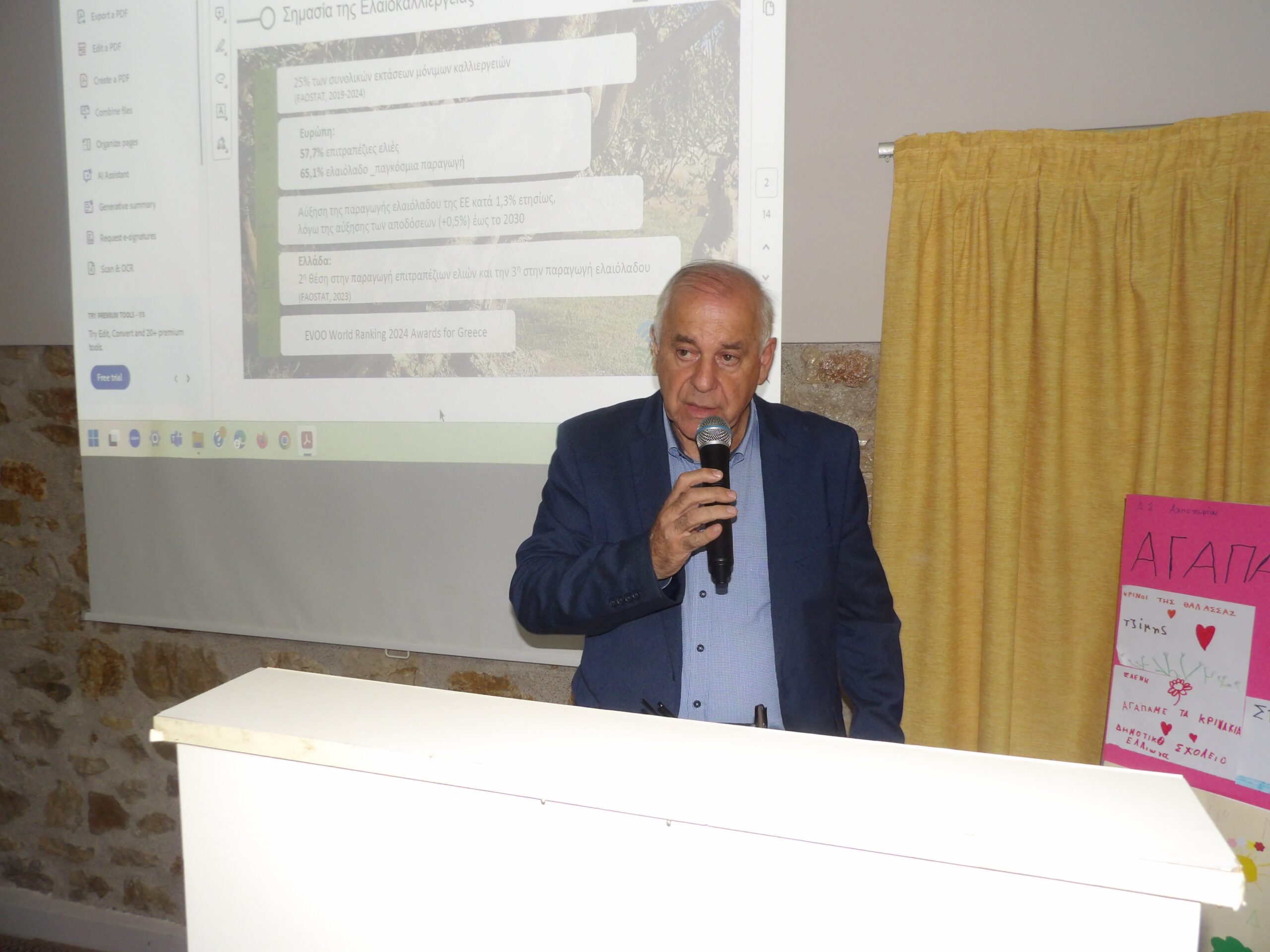 Για το γλoιοσπόριο συγκεκριμένα τόνισε ότι είναι ασθένεια πολύ παλιά αλλά ήλθε να μείνει και μπορεί να κάνει μεγάλη ζημιά με τις αυξημένες οξύτητες, ενώ για την αντιμετώπιση του δάκου της ελιάς ανέφερε πως είναι μια πολύ σύνθετη υπόθεση που χρειάζεται εμπειρία και οργάνωση.