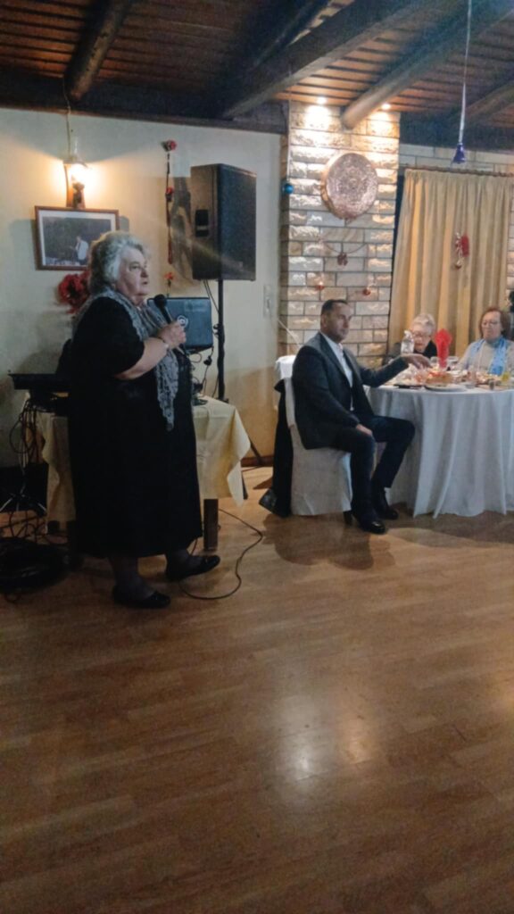 Στο σύντομο χαιρετισμό της η πρόεδρος κα Φιλιώ Νιάρχου αναφέρθηκε στους σκοπούς τους Συλλόγου και έκανε μια μικρή αναφορά στις παραδόσεις τα ήθη και τα έθιμα των ημερών αυτών. Μεταξύ των άλλων είπε: “Οι γιορτές αυτές μας φέρνουν πάντα πιο κοντά και μας δίνουν την ευκαιρία να θυμηθούμε όμορφες στιγμές από τα παλιά. Θυμόμαστε τότε που μαζευόμασταν πιο απλά, με ένα τραπέζι, ένα χαμόγελο και καλή διάθεση. Τότε που η παρέα είχε μεγαλύτερη αξία από οτιδήποτε άλλο και τα Χριστούγεννα ήταν ζεστά, ανθρώπινα και αληθινά.. Τότε που δεν υπήρχαν τηλεοράσεις αλλά ένα ραδιόφωνο που έπαιξε τραγούδια παραδοσιακά και μέσα στη μνήμη μου έχει μείνει ένα τραγούδι που έλεγε ¨Χριστούγεννα Χριστούγεννα ημέρα ευλογημένη, τριγύρω στο τραπέζι μας είναι όλοι μαζεμένοι, οι αδελφές τα αδέλφια μας και ο γέρος μας πατέρας …¨ Σήμερα, με την ίδια αγάπη και το ίδιο πνεύμα, είμαστε πάλι όλοι εδώ.., η ζωή μας προχωράει με την τεχνολογία να μας κάνει συντροφιά σε όλα τα επίπεδα. Ευχές, συζητήσεις, θεάματα κλπ , όχι όμως την τετ α τετ επαφή με τα αγαπημένα μας πρόσωπα. Το παρελθόν εμάς τους μεγαλύτερους μας ακολουθεί και θα πρέπει όσο είναι δυνατόν να προσπαθούμε να αναφερόμαστε και να μην ξεχνιόμαστε από τις παραδόσεις και τα έθιμα μας. Τίποτα όμως από αυτά δεν μπορεί να γίνει χωρίς τη δική σας παρουσία και στήριξη. Η συμμετοχή και η βοήθειά σας μας δίνουν δύναμη κουράγιο, και όρεξη να συνεχίσουμε και να κάνουμε περισσότερα για τον τόπο που όλοι αγαπάμε”