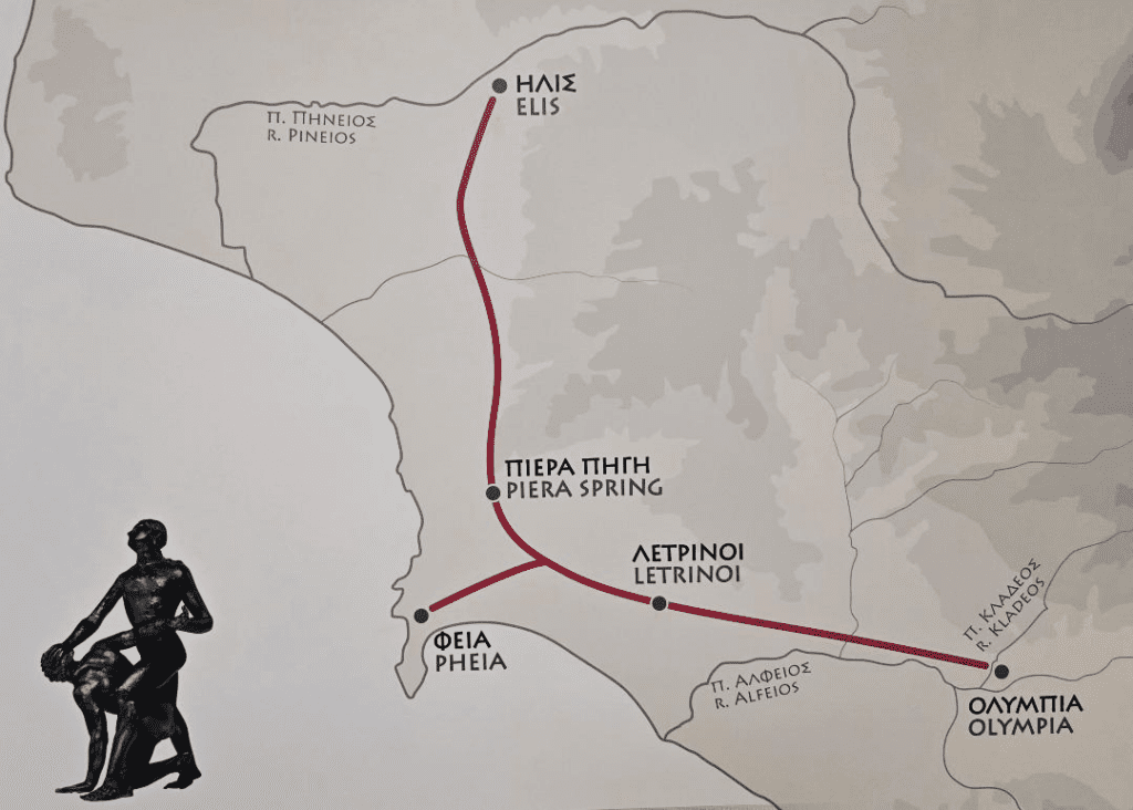Την παραμονή της έναρξης των Ολυμπιακών Αγώνων, σχηματιζόταν, μεγαλοπρεπής Ιερά πομπή, η οποία ακολουθώντας την Ιερά Οδό, έφτανε με πεζοπορία την άλλη μέρα στην Ολυμπία, (διανυκτέρευαν στην μικρή πόλη των Λετρίνων, κοντά στον Πύργο).