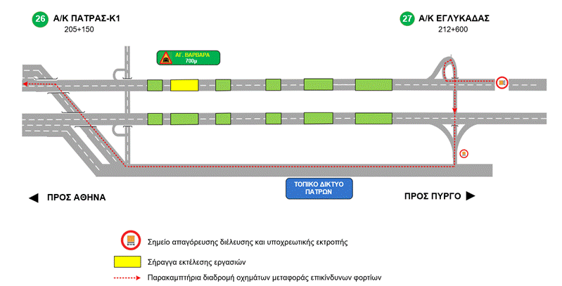 Κατά τη διάρκεια των ρυθμίσεων, τα συγκεκριμένα οχήματα θα εξυπηρετούνται από το τοπικό δίκτυο της Πάτρας (δείτε σχετικό διάγραμμα πιο κάτω). Τις υπόλοιπες ώρες η κυκλοφορία θα διεξάγεται κανονικά και η κατεύθυνση προς Πύργο δεν επηρεάζεται.