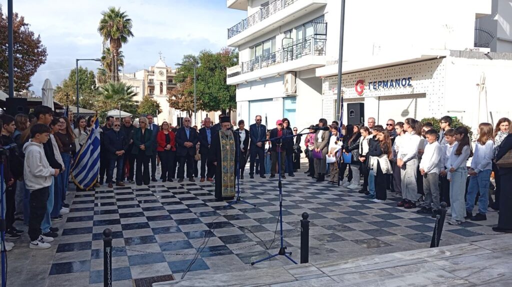 Από νωρίς το πρωί εκδηλώσεις πραγματοποιήθηκαν στο σύνολο των σχολείων του Δήμου, ενώ στη συνέχεια μαθητές κι εκπαιδευτικοί μετέβησαν στο μνημείο Ηρώων, όπου τελέστηκε επιμνημόσυνη δέηση από τον εφημέριο του Ιερού Ναού του Αγίου Αθανασίου π. Αλέξιου Αναγνωστόπουλου.