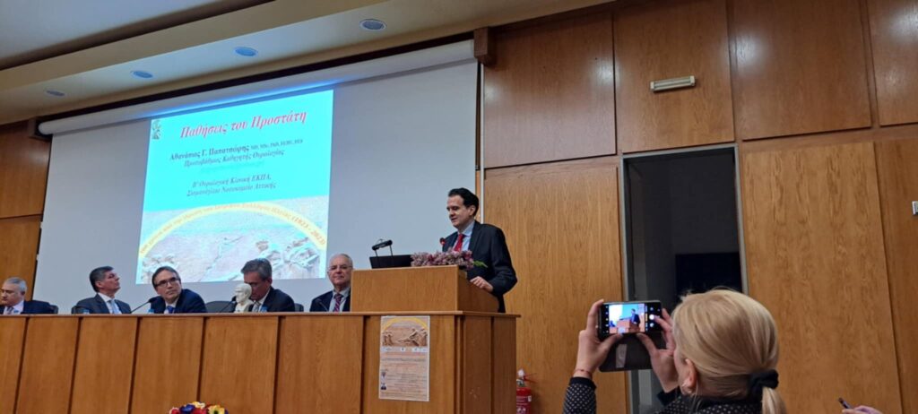 Πρώτος ομιλητής ήταν ο Καθηγητής κ. Αθανάσιο Παπατσώρης που αναφέρθηκε αναλυτικά και εμ απλό τρόπο στις παθήσεις του προστάτη,αρχικά στην καλοήθη υπερπλασία του προστάτη και στα συμπτώματα που πρέπει να κινητοποιήσουν τους ασθενείς όπου το 40% των ανδρών θα πρέπει υποβληθεί σε θεραπεία για να μη εξελιχθεί σε κακοήθες νεόπλασμα. Όπως τόνισε σήμερα έχει αυξηθεί σημαντικά η εμφάνιση καρκίνου του προστάτη που αντιμετωπίζεται κυρίως χειρουργικά. Επισης αναφέρθηκε στους παράγοντες κινδύνου, στο πώς γίνεται η διάγνωση και στο πόσο σημαντικό είναι οι άνδρες να προχωρούν σε εξέταση PSA και διορθικό υπερηχογράγημα προληπτικά έτσι ώστε να αποφύγουν δυσάρεστες εξελίξεις, καθώς ο καρκίνος του προστάτη συχνά είναι διηθητικός και μπορεί να κάνει μεταστάσεις. Γι αυτό και πρέπει να ακολουθείται ο παραπάνω προληπτικός έλεγχος.