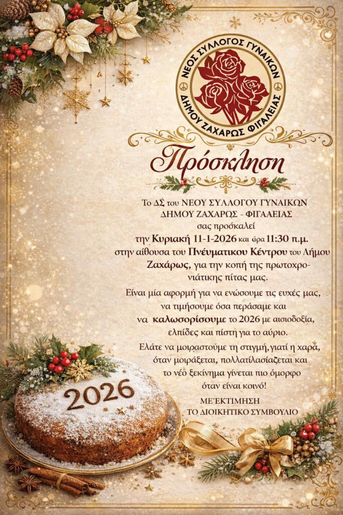 Την πρωτοχρονιάτικη πίτα του κόβει την Κυριακή 11 Ιανουαρίου στις 11:30 το πρωί, ο Νέος Σύλλογος Γυναικών Ζαχάρως-Φιγαλείας στο Πνευματικό Κέντρο του δήμου Ζαχάρως απευθύνοντας ανοιχτό κάλεσμα σε όλους όσοι επιθυμούν να παραστούν αναφέροντας τα εξής : “Ο νέος χρόνος ξεδιπλώνεται μπροστά μας σαν καθαρή σελίδα γεμάτη υποσχέσεις, και σας προσκαλούμε να τον υποδεχθούμε μαζί, με χαμόγελα, και ευχές, την Κυριακή 11-1-2026. Μια αφορμή για να ενώσουμε τις ευχές μας, να τιμήσουμε όσα περάσαμε και να καλωσορίσουμε το νέο έτος”.