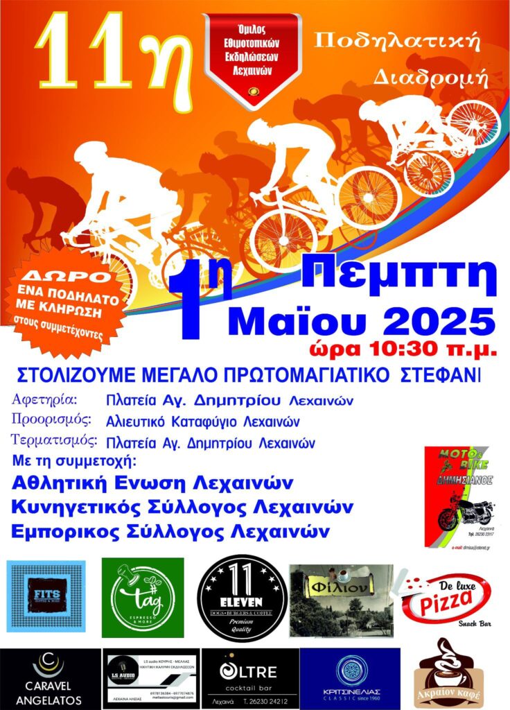 Ο Όμιλος Εθιμοτοπικών Εκδηλώσεων Λεχαινών, σε συνεργασία με άλλους τοπικούς συλλόγους, διοργανώνει την καθιερωμένη του εκδήλωση για την Πρωτομαγιά με την Ποδηλατική διαδρομή και το στολισμό του μεγαλύτερου μαγιάτικου στεφανιού.