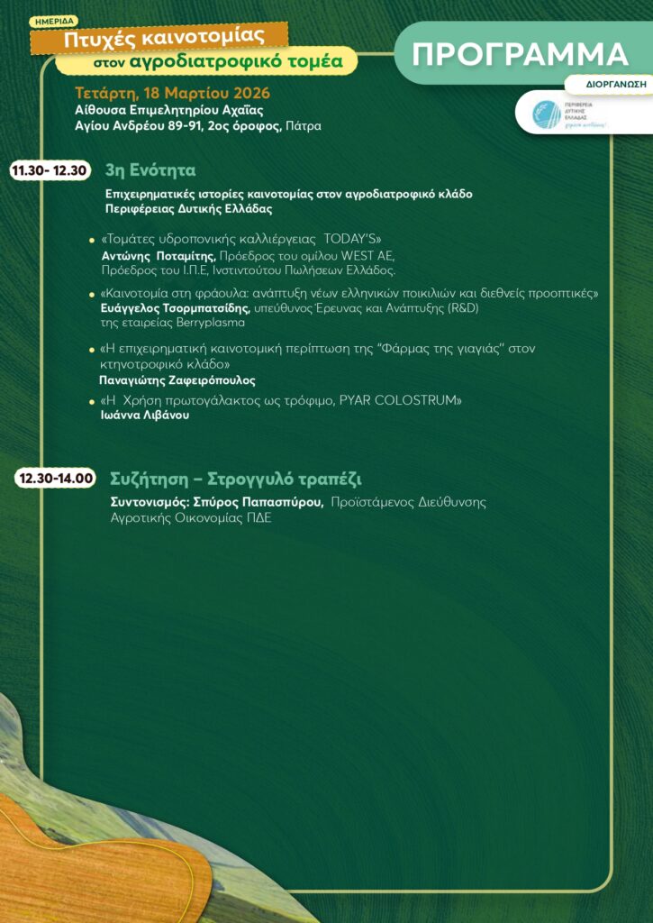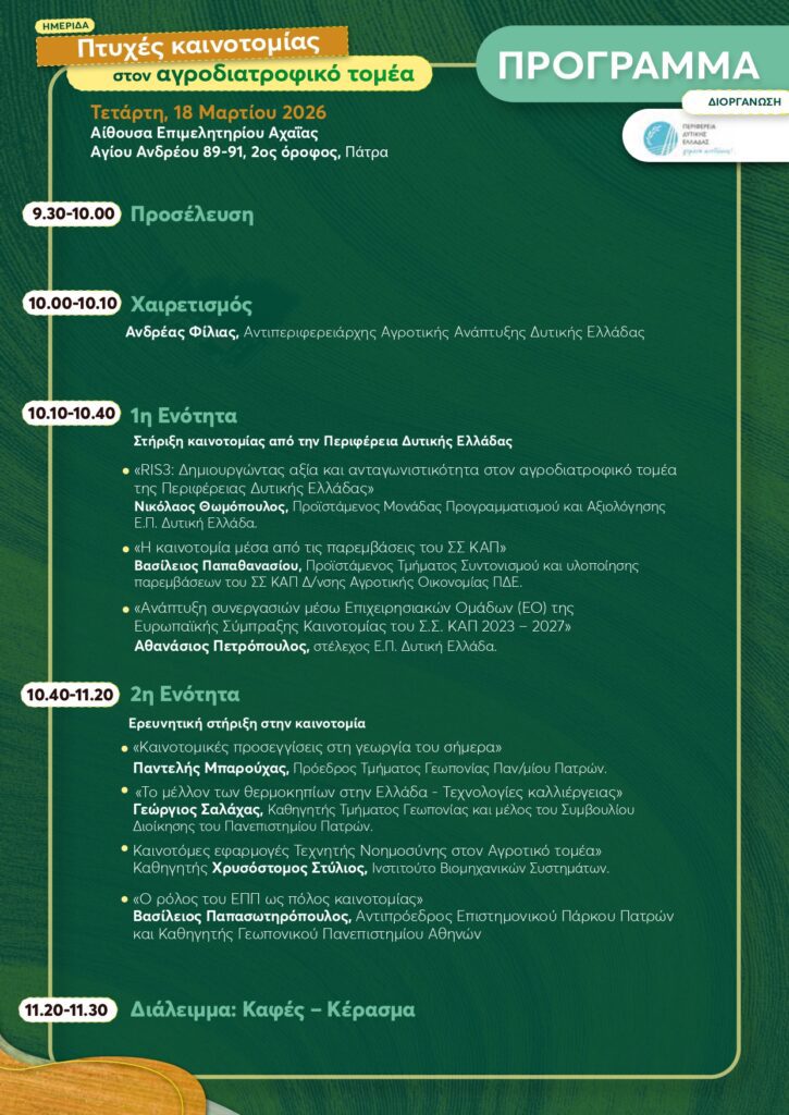 Ημερίδα με τίτλο «Πτυχές καινοτομίας στον αγροδιατροφικό τομέα» θα πραγματοποιηθεί την Τετάρτη 18 Μαρτίου 2026 στις 9:30 στην Αίθουσα του Επιμελητηρίου Αχαΐας, συγκεντρώνοντας εκπροσώπους της επιστημονικής κοινότητας, της αυτοδιοίκησης και της επιχειρηματικότητας, με στόχο την ανάδειξη σύγχρονων τεχνολογικών και ερευνητικών εφαρμογών που ενισχύουν την ανάπτυξη του αγροδιατροφικού κλάδου.