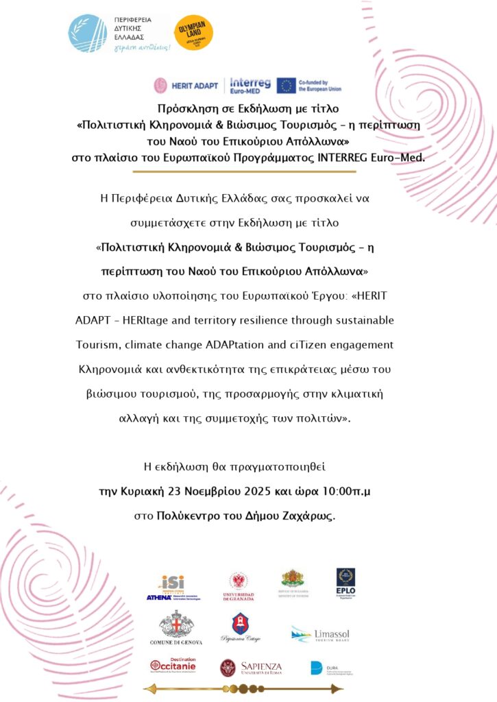 Η Περιφέρεια Δυτικής Ελλάδας διοργανώνει εκδήλωση με τίτλο «Πολιτιστική Κληρονομιά & Βιώσιμος Τουρισμός – η περίπτωση του Ναού του Επικούριου Απόλλωνα», την Κυριακή 23 Νοεμβρίου 2025, ώρα 10:00 π.μ., στο Πολύκεντρο του Δήμου Ζαχάρως. Η δράση πραγματοποιείται στο πλαίσιο του Ευρωπαϊκού Προγράμματος INTERREG Euro-Med και συγκεκριμένα του έργου «HERIT ADAPT – HERItage and territory resilience through sustainable Tourism, climate change ADAPtation and ciTizen engagement».