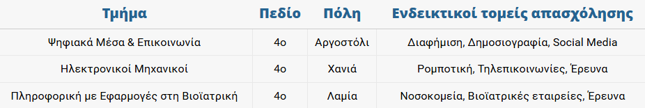 Σύμφωνα με τον σύμβουλο εκπαίδευσης και σταδιοδρομίας Πασχάλης Παρασχάκης από την EMPLOY EDU, υπάρχουν πανεπιστημιακά τμήματα με σύγχρονο προσανατολισμό που συνδέονται άμεσα με τις ανάγκες της αγοράς εργασίας. Παρότι συχνά εμφανίζουν χαμηλότερες βάσεις εισαγωγής, τα προγράμματα σπουδών τους ενσωματώνουν τεχνολογίες αιχμής και διεπιστημονικές γνώσεις.