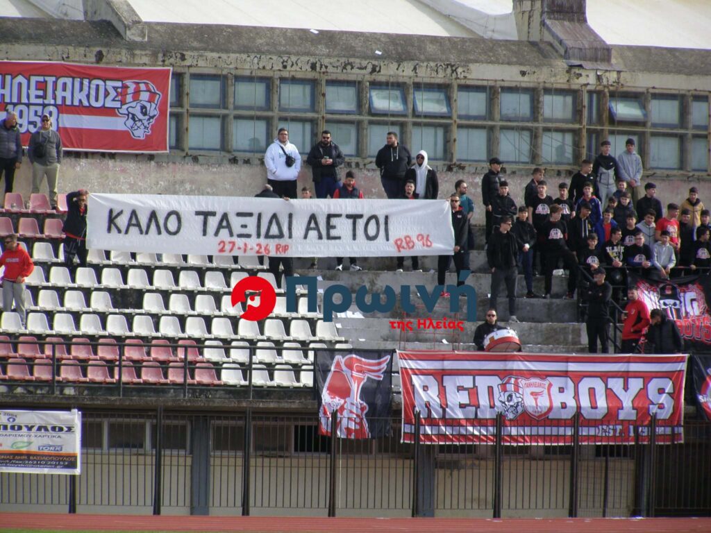 Οι Red Boys μετά την συλλυπητήρια ανακοίνωση που εξέδωσαν για τους αδικοχαμένους οπαδούς του ΠΑΟΚ στη Ρουμανία, το Σάββατο, στο ματς του ΠΑΣ Πύργος με τον Πανγυθεατικό στο Στάδιο Πύργου ανάρτησαν πανό που έγραφε «καλό ταξίδι, αετοί».
