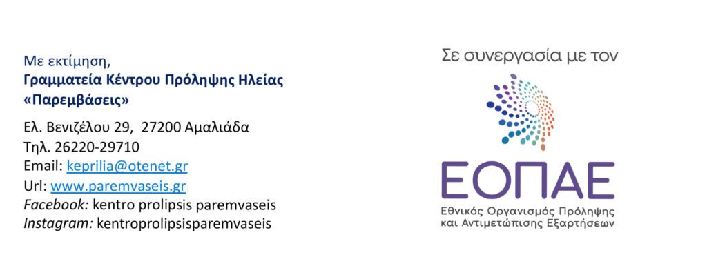 Το Κέντρο Πρόληψης Ηλείας «Παρεμβάσεις», σε συνεργασία με τον Εθνικό Οργανισμό Πρόληψης και Αντιμετώπισης Εξαρτήσεων Ε.Ο.Π.Α.Ε., πραγματοποίησε πρόγραμμα Προαγωγής της ψυχοκοινωνικής υγείας στο Δημοτικό Σχολείο Μακρισίων, έπειτα από αίτημα της σχολικής μονάδας. Το πρόγραμμα περιλάμβανε πέντε (5) συναντήσεις με τους μαθητές, στο πλαίσιο δράσεων που στοχεύουν στην ενίσχυση των κοινωνικών και συναισθηματικών δεξιοτήτων των παιδιών.
