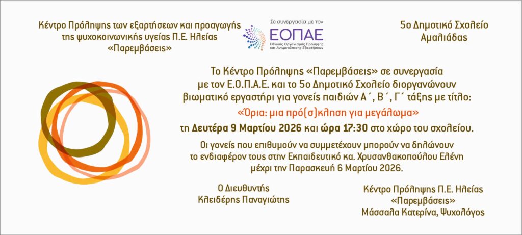 Το Κέντρο Πρόληψης Π.Ε Ηλείας “Παρεμβάσεις” που λειτουργεί σε συνεργασία με τον Ε.Ο.Π.Α.Ε θα πραγματοποιήσει στο 5ο Δημοτικό Σχολείο Αμαλιάδας βιωματικό Εργαστήρι για γονείς παιδιών Α, Β, Γ τάξης με τίτλο: « Όρια: μια πρό(σ)κληση για μεγάλωμα» τη Δευτέρα 9 Μαρτίου 2026.
