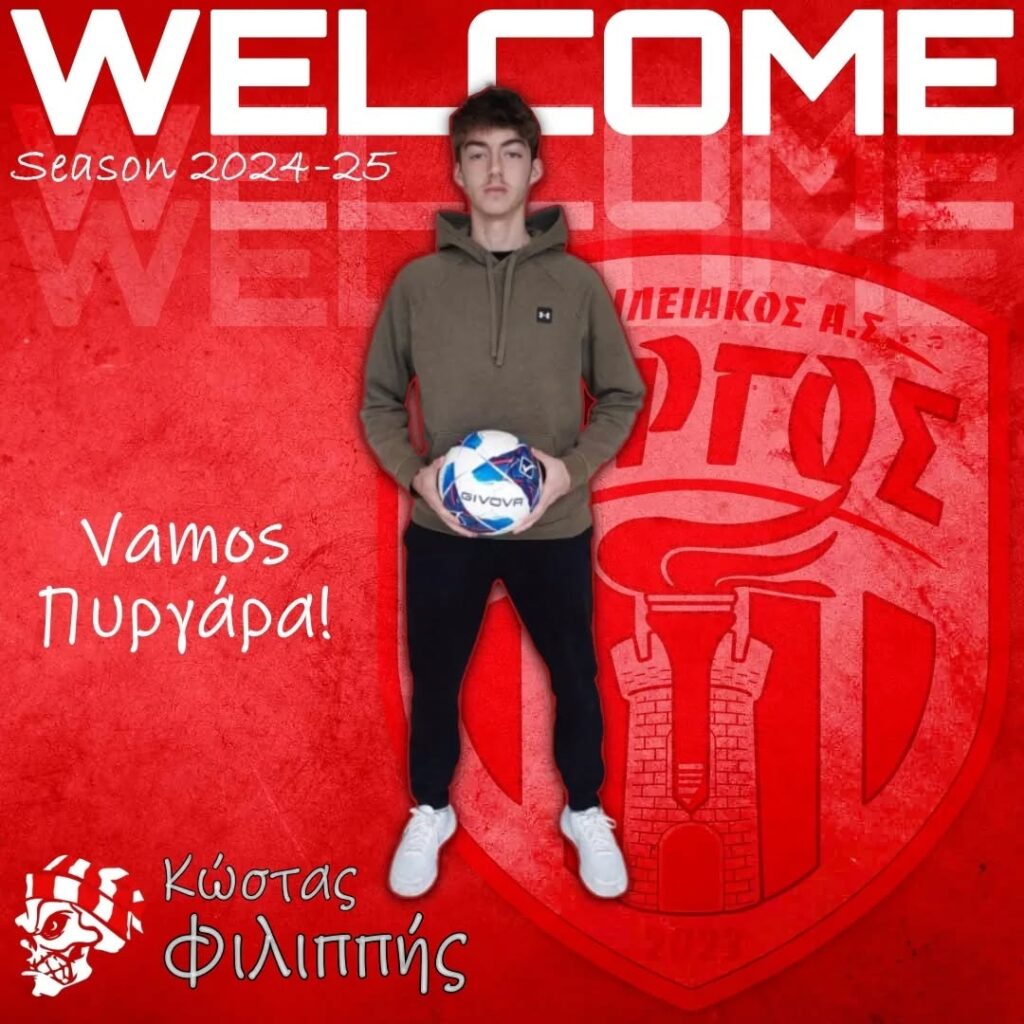 «Το σωματείο μας βρίσκεται στην ευχάριστη θέση να ανακοινώσει την συμφωνία με τον Pyrgos FC Θύελλα για τον δανεισμό του 15χρονου (γεν. 20/3/2009) μεσοεπιθετικού, Κωνσταντίνου Φιλιππή, για το υπόλοιπο της φετινής αγωνιστικής περιόδου.