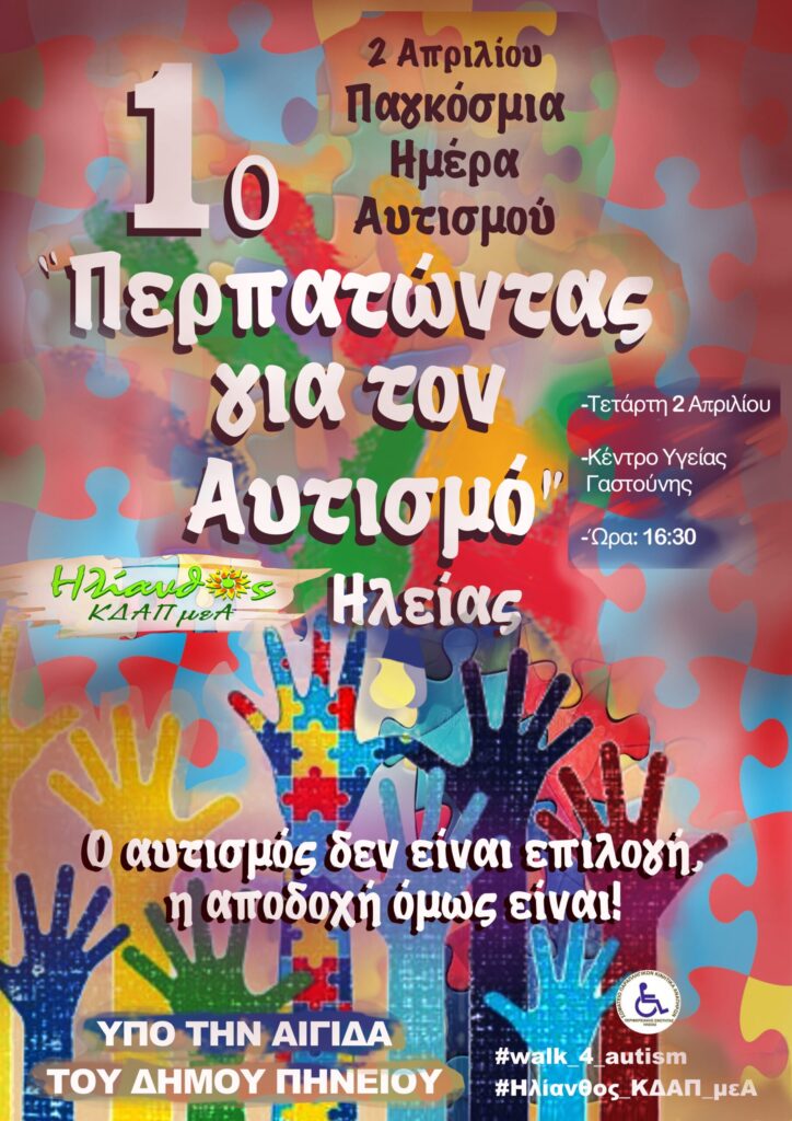 Με αφορμή την Παγκόσμια Ημέρα Ευαισθητοποίησης για τον Αυτισμό, το Κδαπ μεΑ Ηλίανθος με τη συμμετοχή του Σωματείου Παραπληγικών και κινητικά αναπήρων ΠΕ Ηλείας και υπό την αιγίδα του Δήμου Πηνειού, διοργανώνει τον πρώτο περίπατο κινητοποίησης για τον αυτισμό στην Ηλεία.
