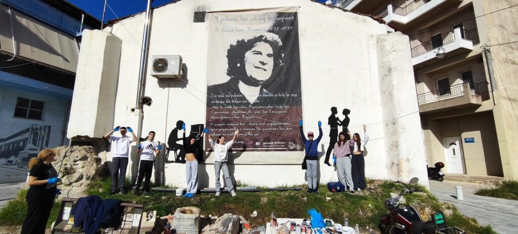 Εικαστική δράση γκράφιτι από το Γραφείο Εθελοντισμού του δήμου Πύργου με την συνδρομή μαθητών του 4ου ΓΕΛ Πύργου στην πλατεία «Μίκη Θεοδωράκη»
