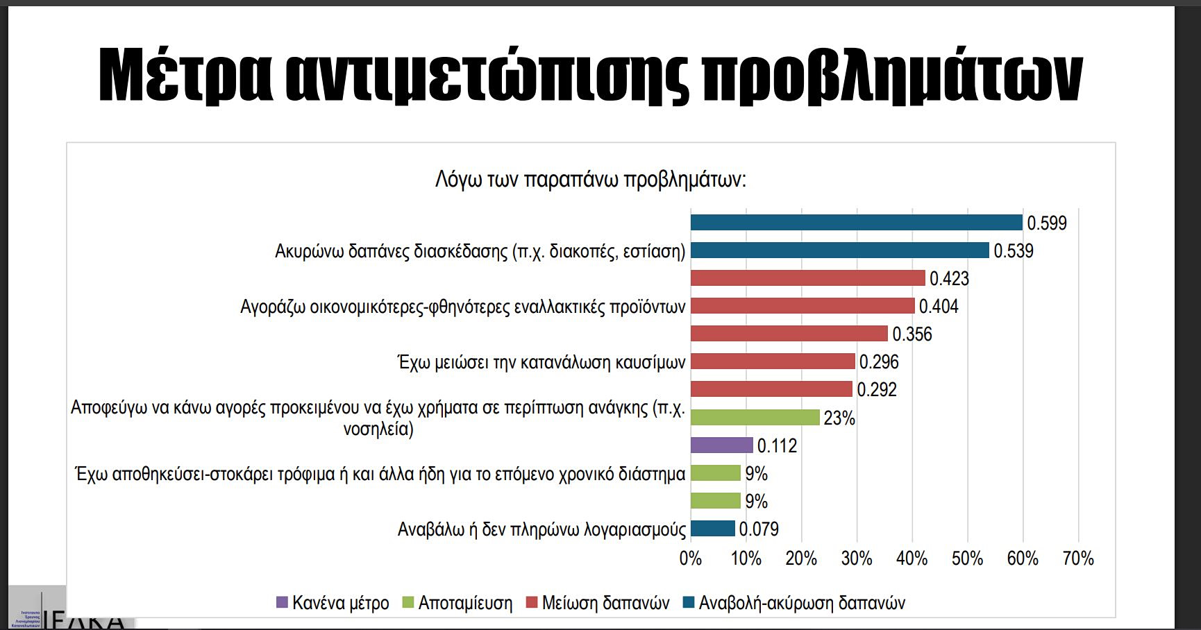 Στην ίδια έρευνα το 72% των καταναλωτών δηλώνει ότι έχει προσαρμόσει τις συνήθειες του στις νέες συνθήκες. Το 35% περιορίζει τις δαπάνες και το 25% μειώνει τις εξόδους του. Παράλληλα, ένα 10% έχει προχωρήσει σε αποθεματοποίηση βασικών προϊόντων – αρχίζει δηλαδή και «στοκάρει» αγαθά για ώρα ανάγκης.