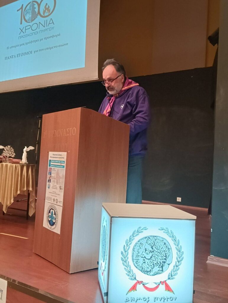 Ο Αρχηγός της ΕΠΠ Ηλείας κ.Κώστας Τριανταφυλλόπουλος περιέγραψε τη διαχρονική δραστηριότητα των Προσκόπων Πύργου στον τομέα της Προστασίας και επαύξησης του Περιβάλλοντος [πυρκαγιές,πλημμύρες,δενδροφυτεύσεις, καθαρισμούς κλ] και ευχαρίστησε αυτούς που συνέβαλαν στην επιτυχία της εκδήλωσης.