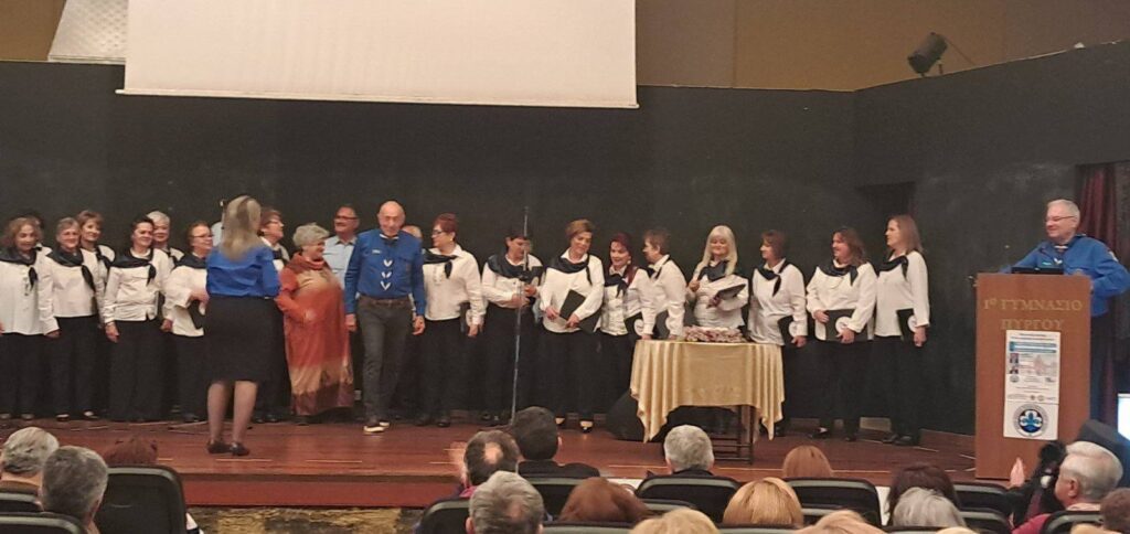 Η εκδήλωση διανθίστηκε από τραγούδια που ερμήνευσε η Χορωδία του Λυκείου Ελληνίδων Πύργου,με τελευταίο τραγούδι τη” συννεφούλα ”που συνόδευε ο κ.Αρνιακός με τη φλογέρα του,μαζί με το κοινό.