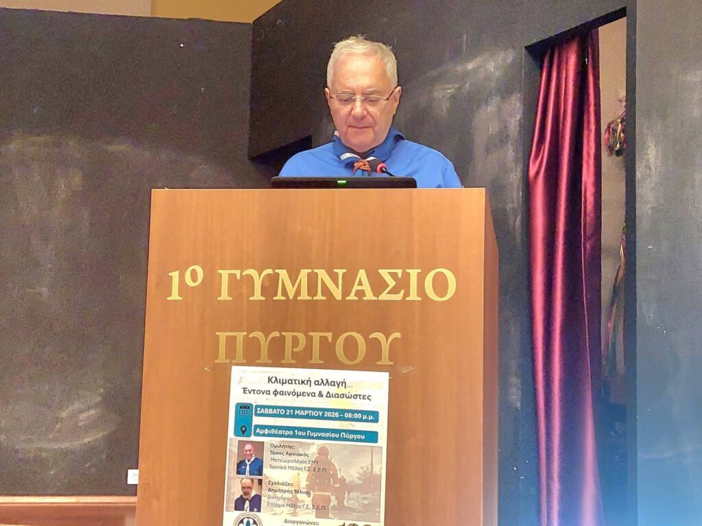 Με ιδιαίτερη επιτυχία πραγματοποιήθηκε η εκδήλωση με θέμα: «Κλιματική Αλλαγή -Έντοναφαινόμενα και Διάσωστες -» που διοργάνωσε η Ένωση Παλαιών Προσκόπων Ηλείας,στην Αίθουσα Εκδηλώσεων του 1ου Γυμνασίου Πύργου, στο πλαίσιο του εορτασμού των 100 χρόνων Ζωής και Δράσης του Πυργιώτικου Προσκοπισμου, όπου ο δημοφιλής μετεωρολόγος και Αρχηγός Εκπαιδευτής του Σώματος Ελλήνων Προσκόπων κ. Τάσος Αρνιακός ανέλυσε με απλό,κατανοητό τρόπο,αλλά και λεπτό χιούμορ, το επίκαιρο αυτό θέμα και την συμβολή της μετεωρολογίας στην πρόβλεψη,μέτρα και διάσωση αλλά και την μεταξύ τους πολύτιμη σχέση μπροστά σε μια δύσκολη κατάσταση,κάνοντας μια περιεκτική αναδρομή στην πορεία της Ανθρωπότητας,μεταφέροντας απόψεις της επιστημονικής κοινότητας,διαχρονικούς στατιστικούς πίνακες,μίλησε για τις διαφορετικού τύπου καταστροφές στην Ηλεία και τόνισε την επαγρύπνηση αλλά και την βελτίωση και την προσπάθεια επαναφοράς της φυσικής ισορροπίας και της πρωτοβουλίες που θα πρέπει να αναληφθούν άμεσα προς αυτή την κατεύθυνση από όλους, ενώ απάντησε σε ερωτήσεις του πολυπληθούς κοινού που κατέκλυσε την αίθουσα.