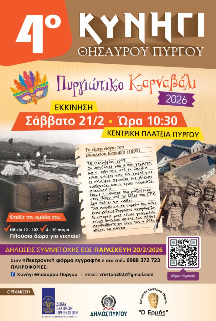 Ο Δήμος Πύργου προσκαλεί μικρούς και μεγάλους να γίνουν μέρος της μεγαλύτερης γιορτής της πόλης! Το Σάββατο 21 Φεβρουαρίου, το «Πυργιώτικο Καρναβάλι 2026» υπόσχεται μια αξέχαστη εμπειρία γεμάτη ενέργεια, δράση και διασκέδαση.