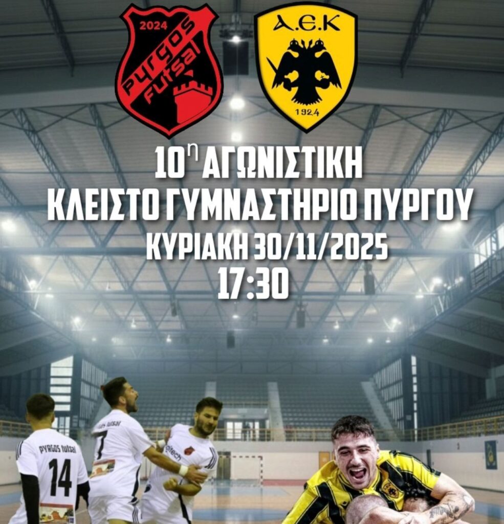Ο Πύργος Futsal για την 10η και προτελευταία αγωνιστική της Futsal Super League υποδέχεται την ερχόμενη Κυριακή 30/11, στις 5.30μ.μ., στο Κλειστό του Πύργου, την πρωταθλήτρια Ελλάδας, ΑΕΚ, η οποία είναι πρώτη και αήττητη στη βαθμολογία (25 βαθμοί), με τρεις βαθμούς περισσότερους από τον δεύτερο Δούκα και μάλιστα έχει φτάσει και στους «16» του Champions League (παίζει αυτή την εβδομάδα διπλούς αγώνες με την Σπόρτινγκ Λισαβόνας).