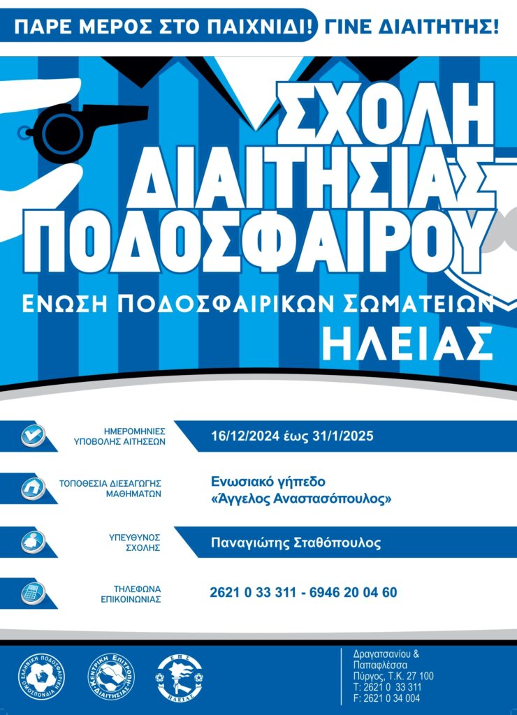 Η ΕΠΣ Ηλείας στα πλαίσια της ανανέωσης του έμψυχου δυναμικού του σώματος της ηλειακής διαιτησίας καλεί τους νέους και τις νέες της Ηλείας που θέλουν να γίνουν διαιτητές να παρακολουθήσουν τα μαθήματα της εισαγωγικής σχολής διαιτησίας στο Ενωσιακό γήπεδο «Άγγελος Αναστασόπουλος».