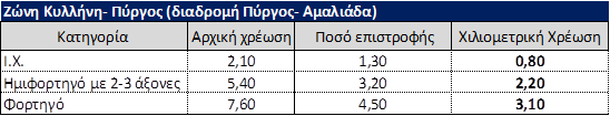 Από την Παρασκευή 20 Μαρτίου 2026 επεκτείνεται η χιλιομετρική χρέωση στην Πατρών-Πύργου, καθώς τίθενται σε λειτουργία οι πύλες και στον κόμβο Αμαλιάδας, εξασφαλίζοντας για τα Ι.Χ. οχήματα μείωση της τάξης του 62%. Η Ολυμπία Οδός έχει εφαρμόσει τη Χιλιομετρική Χρέωση από το 2021 στο τμήμα Ελευσίνα-Κόρινθος-Πάτρα για όλους, Ι.Χ. και επαγγελματικά οχήματα, και τώρα εφαρμόζει το σύστημα σταδιακά στην Πατρών-Πύργου.