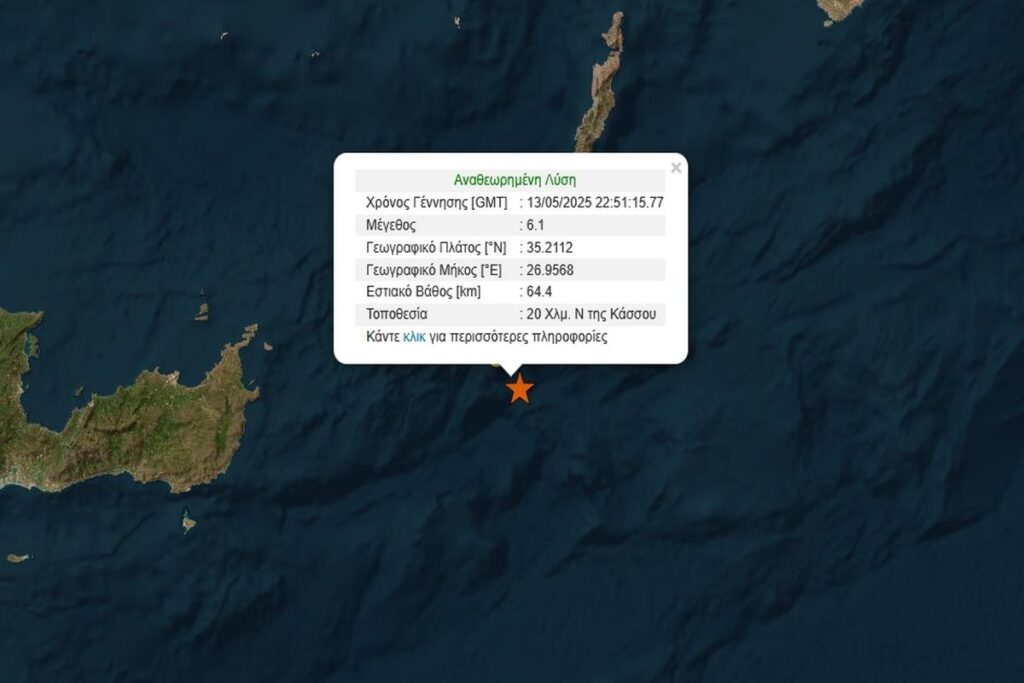 Ισχυρός σεισμός 6,1 Ρίχτερ σημειώθηκε λίγο πριν τις δύο τα ξημερώματα της Τετάρτης ανοιχτά της Κάσου. Σύμφωνα με το Γεωδυναμικό Ινστιτούτο ο σεισμός έγινε 20 χιλιόμετρα νότια της Κάσου και είχε εστιακό βάθος στα 64,4 χιλιόμετρα.