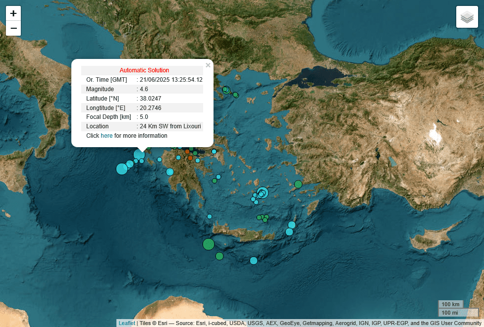 Σεισμική δόνηση μεγέθους 4,6 R σημειώθηκε σήμερα στις 16:25 το απόγευμα στην θαλάσσια περιοχή ανοιχτά της Κεφαλλονιάς (25 χλμ. ΝΔ του Ληξουρίου) στο Ιόνιο, εστιακού βάθους 5 χλμ., σύμφωνα με την αυτόματη λύση του Γεωδυναμικού Ινστιντούτου.
