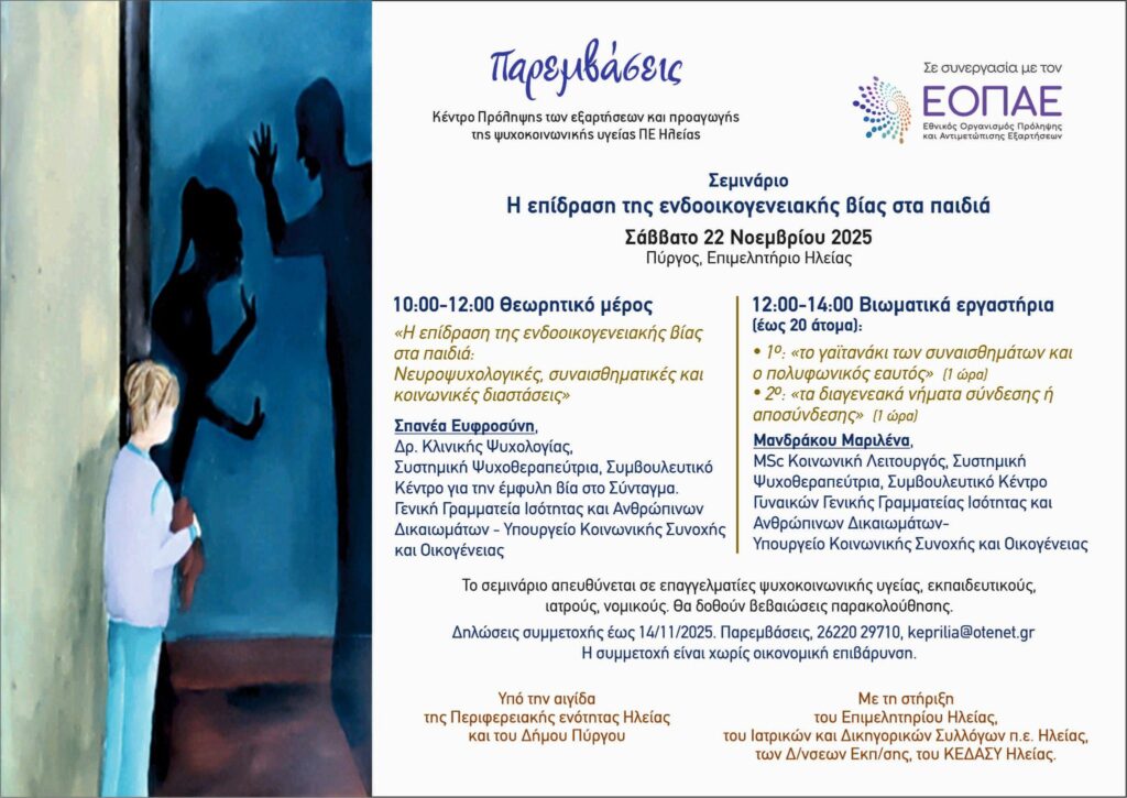 Η ΕΠΙΔΡΑΣΗ ΤΗΣ ΕΝΔΟΟΙΚΟΓΕΝΕΙΑΚΗΣ ΒΙΑΣ ΣΤΑ ΠΑΙΔΙΑ, το Σάββατο 22 Νοεμβρίου 2025, ώρα 10:00-14:00, στον Πύργο, στο Επιμελητήριο Ηλείας