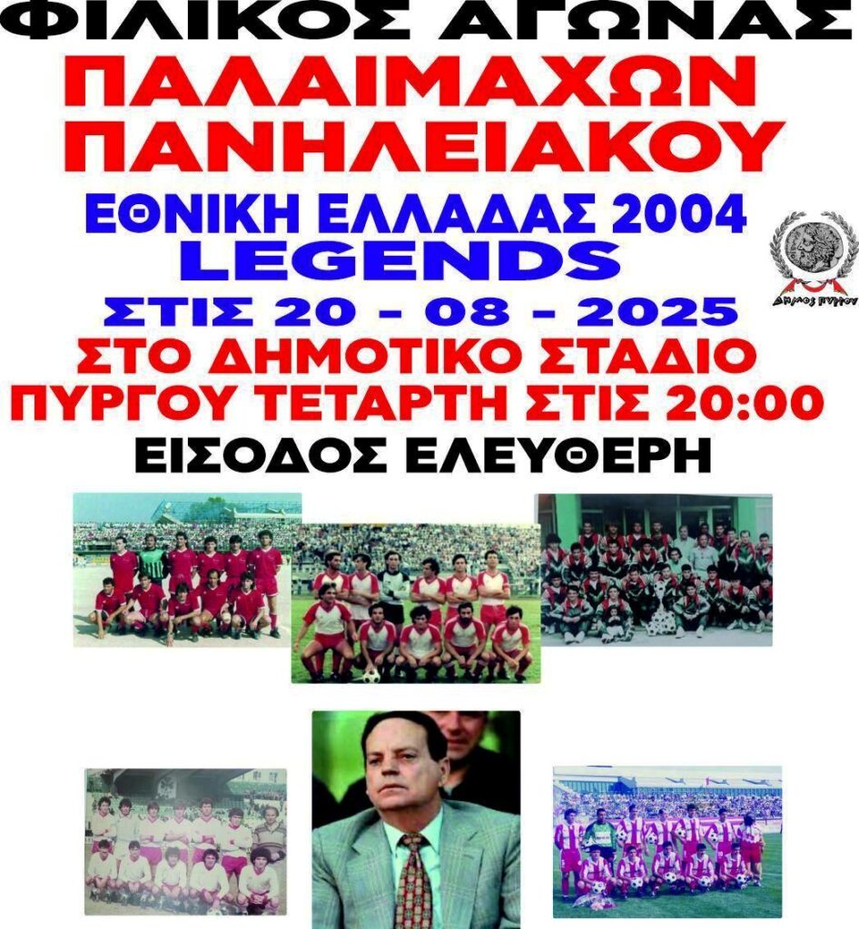 Σήμερα, Τετάρτη, θα διεξαχθεί ο φιλικός αγώνας στη μνήμη του αναμορφωτή του Πανηλειακού, Σάκη Σταυρόπουλου, ανάμεσα στους παλαίμαχους ποδοσφαιριστές του Πανηλειακού και την Εθνική Ομάδα του 2004 (Legends 2004), που κατέκτησε το EURO 2004. Το παιχνίδι θα διεξαχθεί στο Δημοτικό Στάδιο Πύργου με ώρα έναρξης τις 8μ.μ..