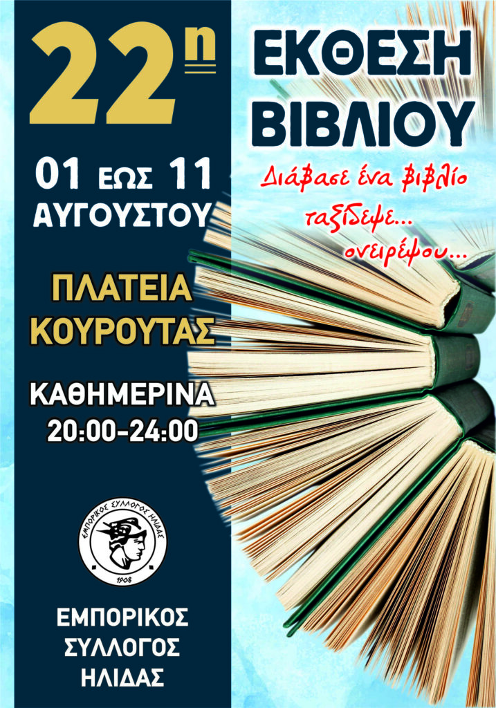 Όπως κάθε χρόνο έτσι και φέτος, η καρδιά του βιβλίου θα χτυπά ξανά στην πλατεία της Κουρούτας, όπου ανοίγει τις πύλες της ην Παρασκευή 1η Αυγούστου, η 22η Έκθεση Βιβλίου που διοργανώνει ο Εμπορικός  Σύλλογος Ήλιδας.