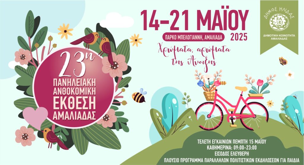 Η ΠΑΝΗΛΕΙΑΚΗ ΑΝΘΟΚΟΜΙΚΗ ΕΚΘΕΣΗ 2025 θα ανοίξει τις πύλες στο πάρκο Μπελογιάννη την Τετάρτη 14 Μαΐου 2025 στο πάρκο Μπελογιάννη, ενώ θα παραμείνει στο κέντρο της πόλης έως και την Τετάρτη 21 Μαΐου 2024, με ώρες λειτουργίας από τις 9:00 το πρωί έως 11:00 το βράδυ.