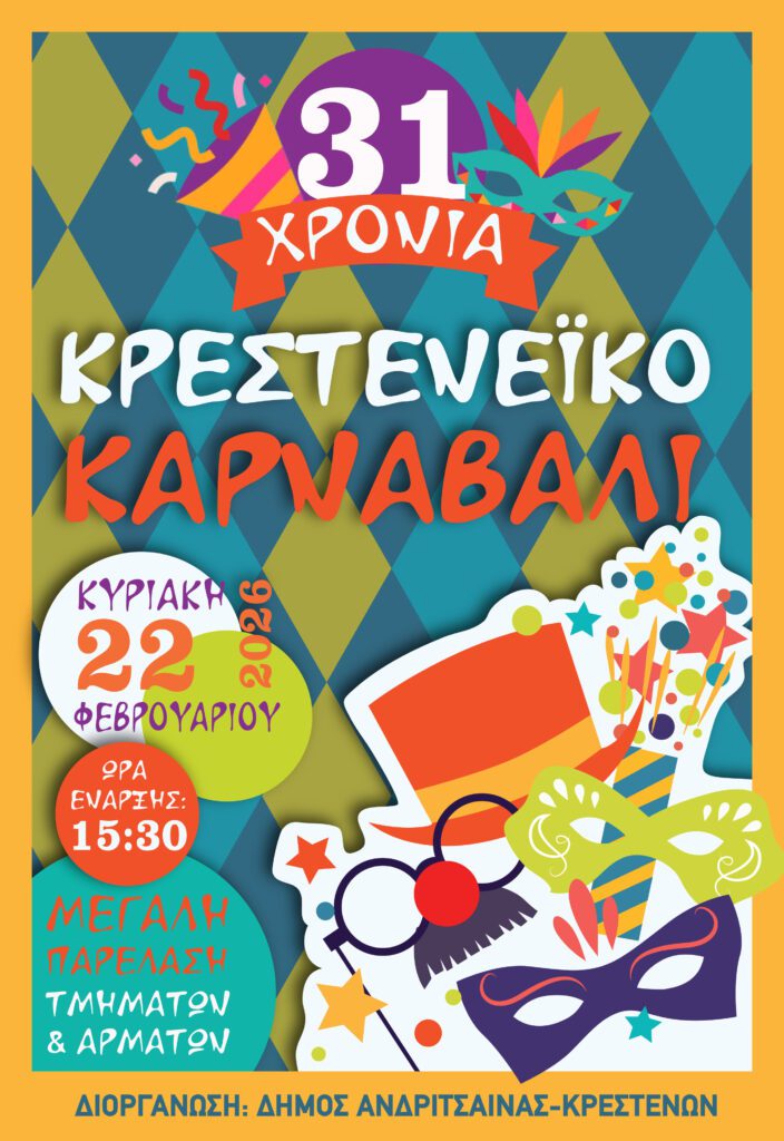 «Ανάσα» στην καθημερινότητα θα δώσουν οι καρναβαλικές εκδηλώσεις που προγραμματίζονται την περίοδο των Απόκρεων στο Δήμο Ανδρίτσαινας-Κρεστένων, με αποκορύφωμα το 31ο Κρεστενέικο Καρναβάλι, το οποίο θα διεξαχθεί την Κυριακή 22 Φεβρουαρίου και ώρα 3:30 μ.μ., στους κεντρικούς δρόμους της πόλης.