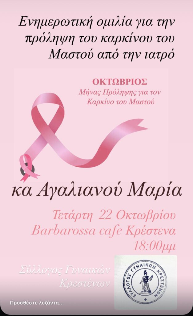 Ο Σύλλογος Γυναικών Κρεστένων διοργανώνει στο πλαίσιο αυτό, ενημερωτική ομιλία για την Πρόληψη του καρκίνου του Μαστού από την εξαιρετική Ιατρό Ακτινοδιαγνώστη κα ΑγαλιανούΜαρία, την Τέταρτη 22 Οκτώβρη στις 6:00μμ στο Barbarossa cafe στην Κρέστενα.