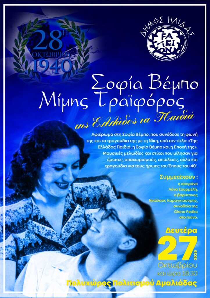 Με τη μουσική, τη μνήμη και τη συγκίνηση να συναντούν την Ιστορία, ο Δήμος Ήλιδας τιμά τη γυναίκα που σφράγισε με το έργο της το συλλογικό μας βίωμα: τη Σοφία Βέμπο. Η εκδήλωση, υπό τον τίτλο «Της Ελλάδος Παιδιά – Η Σοφία Βέμπο και η Εποχή της», αποτελεί ένα μελωδικό οδοιπορικό στην περίοδο του Έπους του 40’, μέσα από τραγούδια που ενέπνευσαν, συγκίνησαν και εμψύχωσαν ολόκληρο το έθνος.