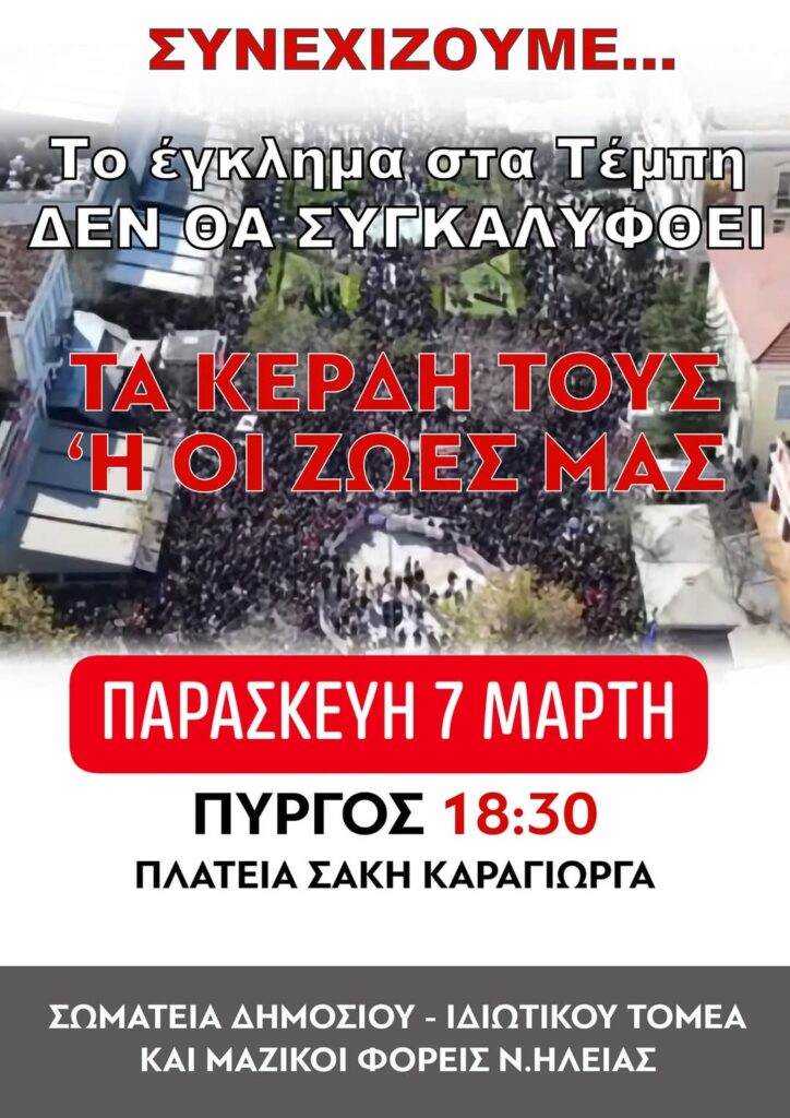 Τα σωματεία Δημοσίου-Ιδιωτικού Τομέα και μαζικοί φορείς Ν. Ηλείας καλούν σε συγκέντρωση την Παρασκευή 07/03/26 στον Πύργο, στην Πλατεία Σάκη Καράγιωργα-ώρα 18:30.